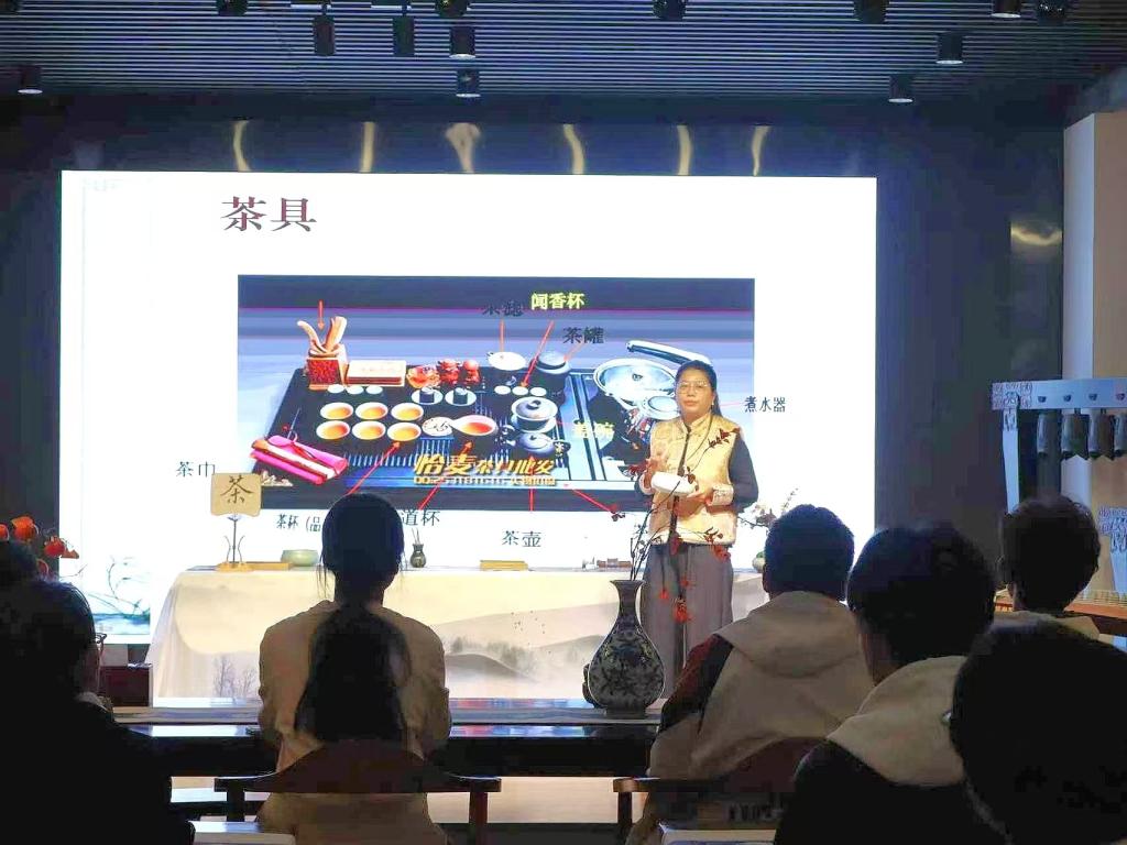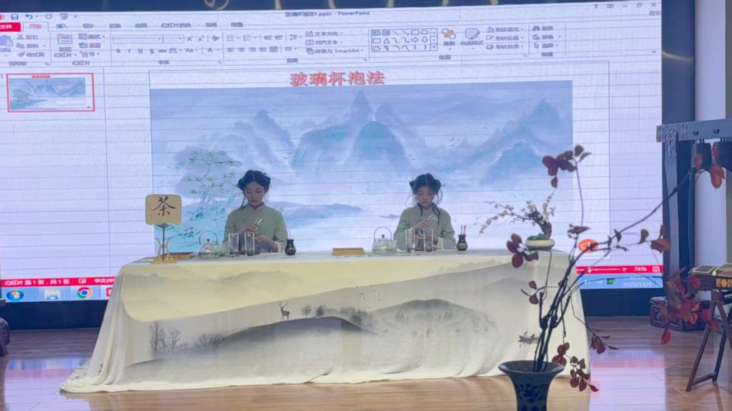 活动伊始,李庆会博士以亲切的自我介绍拉近了与员工的距离。随后,她以生动幽默的语言,从泡茶的温度这一关键要素切入,系统讲解了绿茶、普洱茶、乌龙茶等常见茶类的适宜水温、茶水比例及冲泡技巧,使同学们对茶叶冲泡的科学性与艺术性形成了清晰认识。在此基础上,李博士进一步围绕茶礼仪的核心内涵展开阐述,精妙解读了“礼者,敬人也”这一基本理念,深刻揭示了茶文化中蕴含的尊重、谦和与自省的人文精神,为同学们构建起一个兼具理论深度与实践意义的茶礼仪认知框架。紧接着,茶艺表演环节将现场氛围推向高潮。现场依次呈现了三套独具特色的冲泡技艺:在玻璃杯冲泡展示中,2024级茶学班王佳宇与刘晓亚同学运用“下投法”,素手轻扬,以“凤凰三点头”的经典手法注水三巡,水流如瀑,既充分激荡茶叶,亦传递出对来宾的深深敬意。嫩叶在杯中舒展沉浮,宛若碧波起舞,生动诠释了绿茶特有的“茶舞”之美。在盖碗冲泡环节,2023级茶学班张琪与魏晴同学手法精准娴熟,通过调节盖隙巧妙控制水温,不仅展现了盖碗集容纳、冲泡、品鉴于一体的实用价值,更传递出“三才碗”所蕴含的天、地、人三才和合的哲学意境。