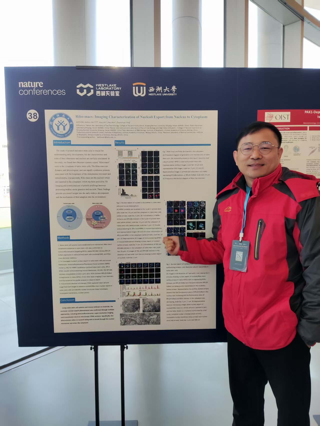 秦克周老师基于自身近期研究成果撰写的学术墙报,经大会组委会严格筛选后成功入选,并在会议现场进行展示。墙报内容聚焦于两种干细胞模型的成像特征,即Primed干细胞向Naïve干细胞转化过程中的“核仁出核”现象的首次发现。该研究工作采用多种成像手段,既体现了扎实的研究基础,也展现了创新的学术思路,吸引了众多参会学者驻足观看、交流探讨。在互动过程中,多位业内知名专家对该研究给予关注,其中一位专家在深入了解研究细节后评价道:“此项工作非常有意思”,高度认可研究的创新性与探索价值。公司秦老师不仅详细介绍了研究背景、方法与成果,同时认真听取同行及专家的意见建议,为后续研究工作的深化与拓展积累了宝贵经验。