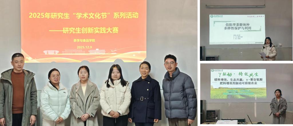 12月9日上午,在综合实验楼4楼研讨室举行“研究生创新实践大赛”院内选拔,2支队伍参赛。1支队伍参加的主题赛事为“双碳”创新与创意大赛,题目是“缓释增效,生态共赢:γ-聚谷氨酸肥料增效剂驱动可持续农业”;1支参赛队参加的主题赛事为“美丽中国”创新设计大赛——生物多样性保护与利用创新大赛,题目是“信阳旱茶群体种多样性保护与利用”。通过员工汇报,评委点评,最终评出一等奖1名,二等奖1名,并上报研究生院。