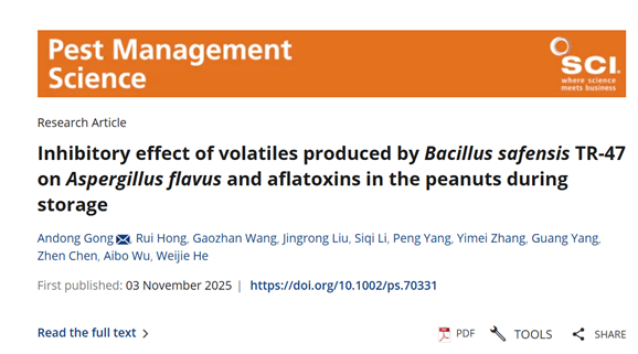 2025年11月8日,国际权威学术期刊《Pest Management Science》(该期刊属SCI收录、中科院农林科学一区TOP期刊)在线刊发了公司宫安东博士团队的研究论文,论文题为《Inhibitory effect of volatiles produced by Bacillus safensis TR‐47 on Aspergillus flavus and aflatoxins in the peanuts during storage》。